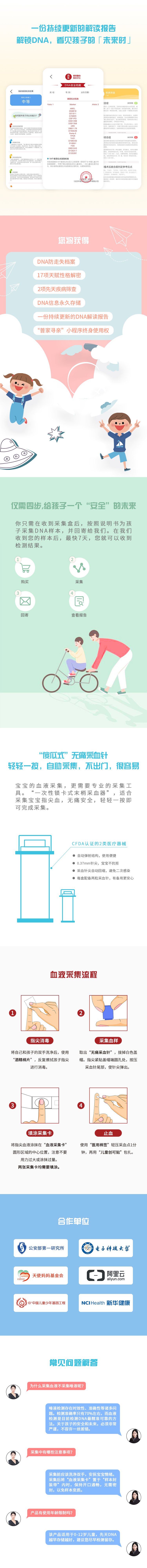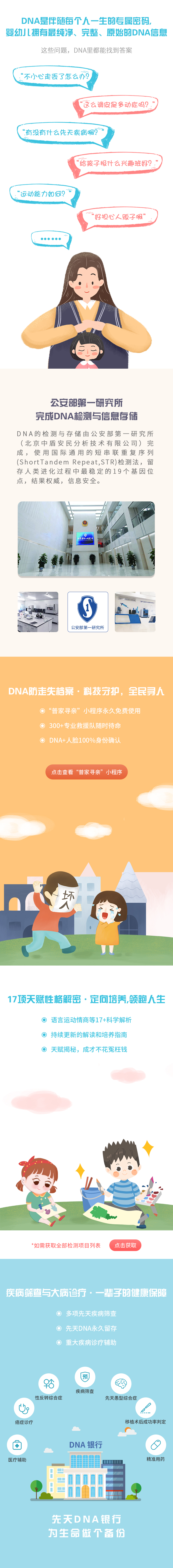 检测及预存先天DNA,建立DNA防走失安全档案,助力儿童远离走失拐卖伤害;17项天赋性格解密,定向培养,领跑人生,成才不花冤枉钱;先天疾病筛查与大病诊疗,先天DNA永久留存,一辈子的健康保障。